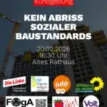 Ein breites Bündnis aus Parteien und Verbänden ruft zu einer Kundgebung am kommenden Freitag, den 20.02. um 16:30 Uhr, auf dem Rathausplatz auf. Anlass ist ein für nächste Woche vorgesehener Stadtratsbeschluss, der soziale und ökologische Standards beim Wohnungsbau für die meisten Projekte in Regensburg abschaffen könnte.