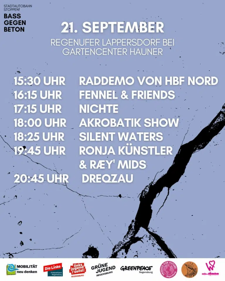 - Protestkundgebung am Regenufer Lappersdorf mit Reden, Bands und VoKü