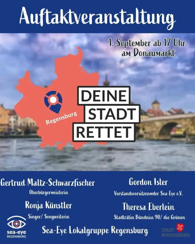 Von 1. September bis 31. Dezember 2025 verdoppelt die Stadt Regensburg jede einzelne Spende an Sea-Eye – bis zu einer Gesamthöhe von 30.000 €. Am kommenden Montag, den 1. September findet die Auftaktveranstaltung zu Regensburg Rettet statt. Dort erwarten euch Redebeiträge von unserer Bürgermeisterin, Gertrud Maltz-Schwarzfischer, dem Vorstandsvorsitzendem von Sea-Eye, Gorden Isler und der Stadträtin Theresa Eberlein, von Bündnis 90/ die Grünen. Dazu gibt es musikalische Untermalung von Ronja Künstler.