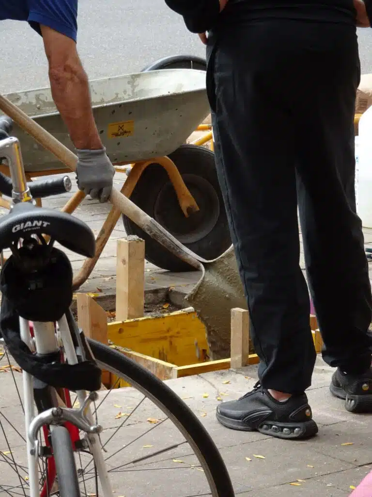 Die Beton-Fundamentierung der Reparaturstation wurde durch einen wohnungslosen Mitarbeiter des Nachbarschaftstreffs ausgeführt