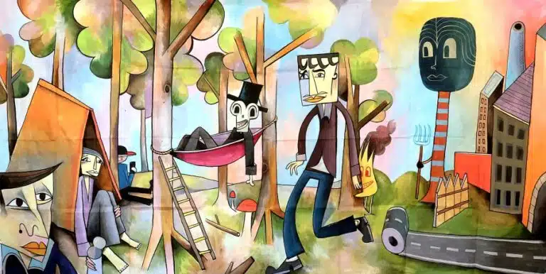 Jim Avignon, weltbekannter Popartkünstler eröffnet am Freitag 21.11. 2025 um 19 Uhr seine Ausstellung Stadt- Land – Club in der Galerie Beim weissen Lamm, Lange Gasse 7, 93183 Kallmünz. Im Anschluss Musik mit seiner one- man- band Neoangin. Der in Berlin ansässige Künstler ist bekannt durch sein Bild an der East Side Gallery und seinem comicartigen, unverwechselbaren Stil, mit schwarzen Konturen und mit kräftigen Farben. In seinen farbenfrohen Zeichnungen und Wandgemälden sind Szenen aus Clubs, Freundschaft, Stadt, Arbeit und menschlichen Irrwegen zu sehen. Aber die Bilder sind nicht nur fröhlich sondern beinhalten fast immer auch eine versteckte Gesellschaftskritik. Er enttarnt unser Konsumverhalten, die Umweltkrise und unsere Hast dem technischen Fortschritt hinter herzukommen. Sich selbst hat er mal als den schnellsten Künstler der Welt bezeichnet. „Ich bring dann zur Ausstellung Alles mit, Bilder und Musikinstrumente und Reise mit dem Zug an“ informiert er uns. Er ist schnell im Malen und im Entscheiden. Wenn mal was nicht klappt fällt ihm eine Alternative ein, sagt er.