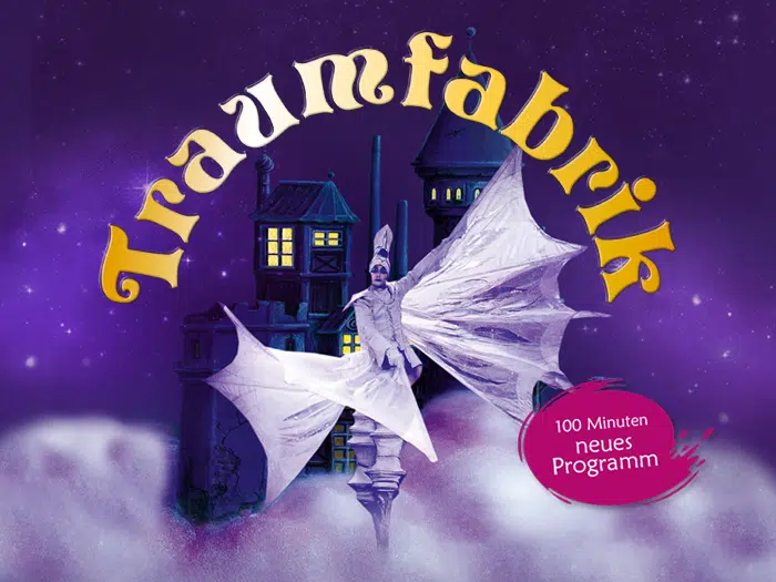 100 Minuten neues Programm! Varieté, Theater, Artistik & Tanz vereint zu einer faszinierenden Inszenierung aus Poesie, Humor und Schönheit in kleinen Geschichten so bunt wie Ihre Träume… Salto-Akrobaten, Sandmalerinnen, Hula-Hoop-Artistinnen, Jongleure, Tänzerinnen, Handstand-Akrobaten lassen Objekte schweben, formen Sand zu unglaublichen Bildern und scheinen mit ihren Körpern jeder Schwerkraft zu trotzen. Zu mitreißender und bewegender Musik von Klassik bis Rock und kunstvoll abgestimmten Licht-Design zieht die Traumfabrik ihre Zuschauer in die Welt der Träume und Phantasie – mal laut, mal leise – mal poetisch, mal humorvoll. Ein Erlebnis für alle Generationen – in 10 Städten immer nach Weihnachten! Lassen Sie sich entführen und träumen Sie mit! Meet & Greet nach der Show Und das Schönste: Nach dem Schlussapplaus fällt nicht der Vorhang. Denn Sie können die Künstler noch an der Bühne hautnah treffen, mit ihnen plaudern, mit ihnen jonglieren – und ein Erinnerungsfoto machen. Von Mensch zu Mensch.