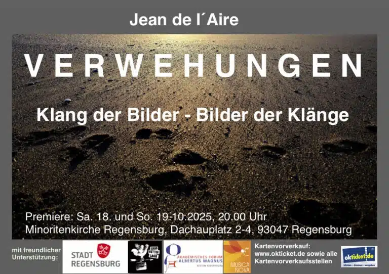 Die Minoritenkirche in Regensburg inszeniert der Künstler Jean de L’Aire vielschichtig mit Musik, Bild und Wort. Dafür hat der bekannte Regensburger Komponist, Foto- und Videoakteur ein multimediales Gesamtkunstwerk geschaffen. Ausgedehnte, das Publikum umkreisende Raum-Klang-Bewegungen der Live-Performance mit Violoncello, iranischem Santûr und weiteren außergewöhnlichen Instrumenten lassen zugleich zur visuellen Reise ein Hörerlebnis ganz besonderer Art erfahrbar werden. Die Bezugnahme zwischen Musik, Bildern und Gedichten (Paul Celan) schafft Transzendenz. Vom Komponisten ausgewählte Liebesgedichte ziehen sich durch Gelebtes und Geliebtes, Spuren, wie vom Wind verweht, entschwinden – um doch in der Gestalt der Erinnerung lange noch fortzudauern.