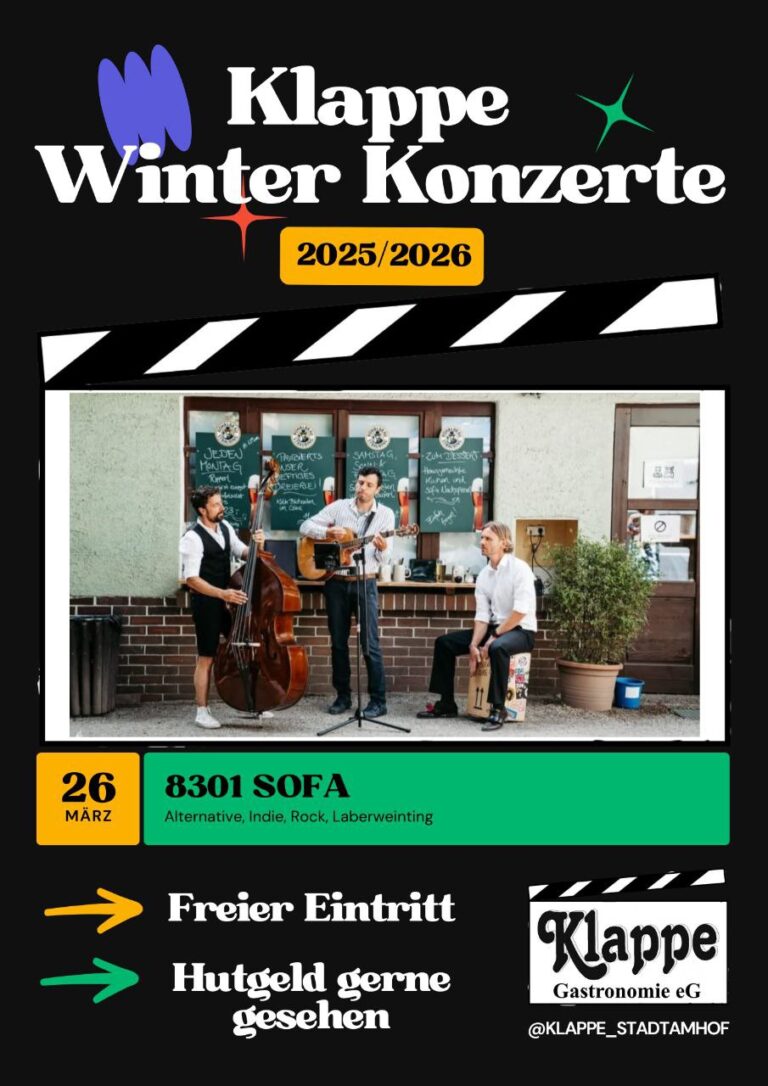 Musikkneipe Klappe Stadtamhof 13, RegensburgZum Abschluss der Winterkonzert-Reihe spielt das Trio 8301 SOFA Ende März in der Klappe.