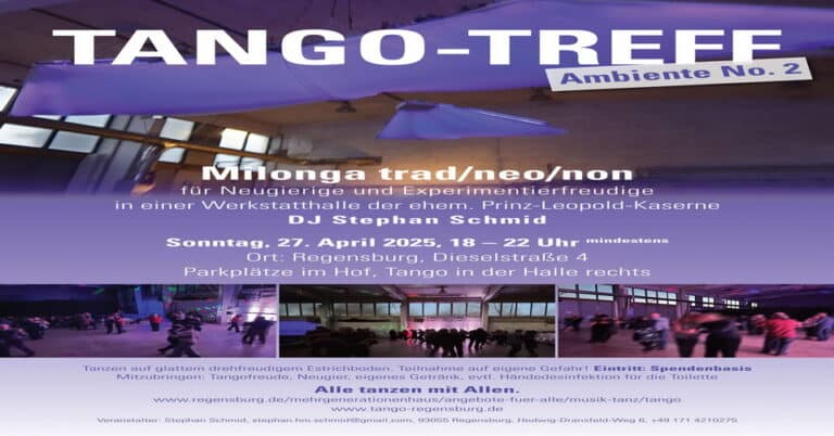 Seit 2000 in den Tango verliebt. 2021/22 Fortbildung zum Tango-DJ bei Carlos Hamburg. DJ-Engagements bei Tango-fuego Südfrankreich und Bendito-Tangomarathon Pielenhofen. Veranstalte Milongas im Mehrgenerationenhaus Regensburg, im Kultutviertel ehem. Prinz-Leopold-Kaserne, im Leeren Beutel und hoffentlich bald auch auf der von mir initierten und mitgeplanten Open-Air-Tanzfläche beim Bahnhof Regensburg.